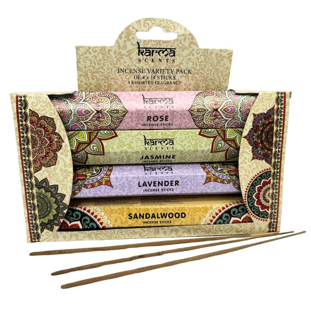 Darčeková krabička vonných tyčiniek Karma z kolekcie ARÔME obsahuje výber 4 druhov vôní vonných tyčiniek.